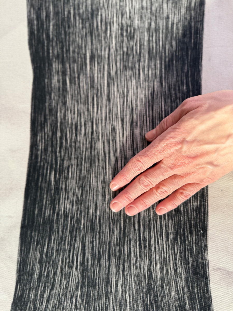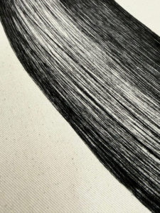 Forma wyłania się z rytmicznej, powtarzalnej linii — spokojna, skupiona, niemal ascetyczna. Nie odsyła do konkretnego obrazu, ale przywołuje skojarzenia. Pozostaje autonomiczna, zamknięta w swoim własnym porządku.