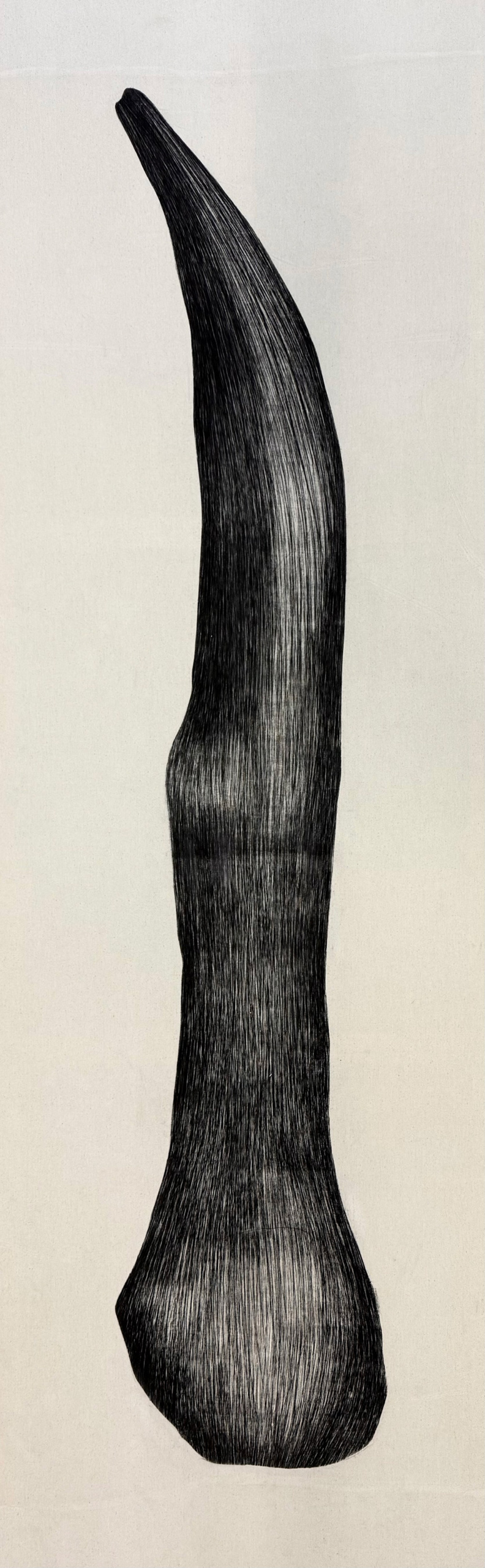 Forma wyłania się z rytmicznej, powtarzalnej linii — spokojna, skupiona, niemal ascetyczna. Nie odsyła do konkretnego obrazu, ale przywołuje skojarzenia. Pozostaje autonomiczna, zamknięta w swoim własnym porządku.