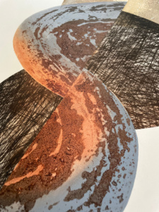 Surowa, smolista faktura. Rdzawe i brązowe odcienie przełamane stalową szarością. Masywna, organiczna forma. Huba.