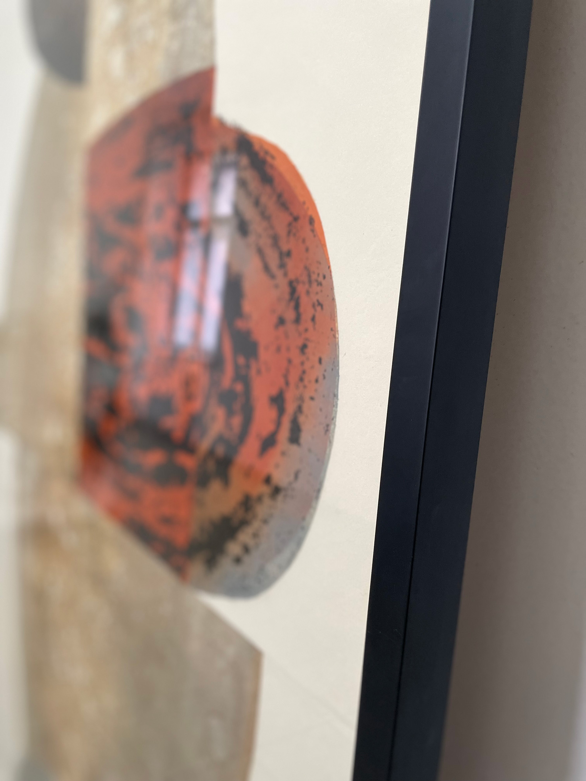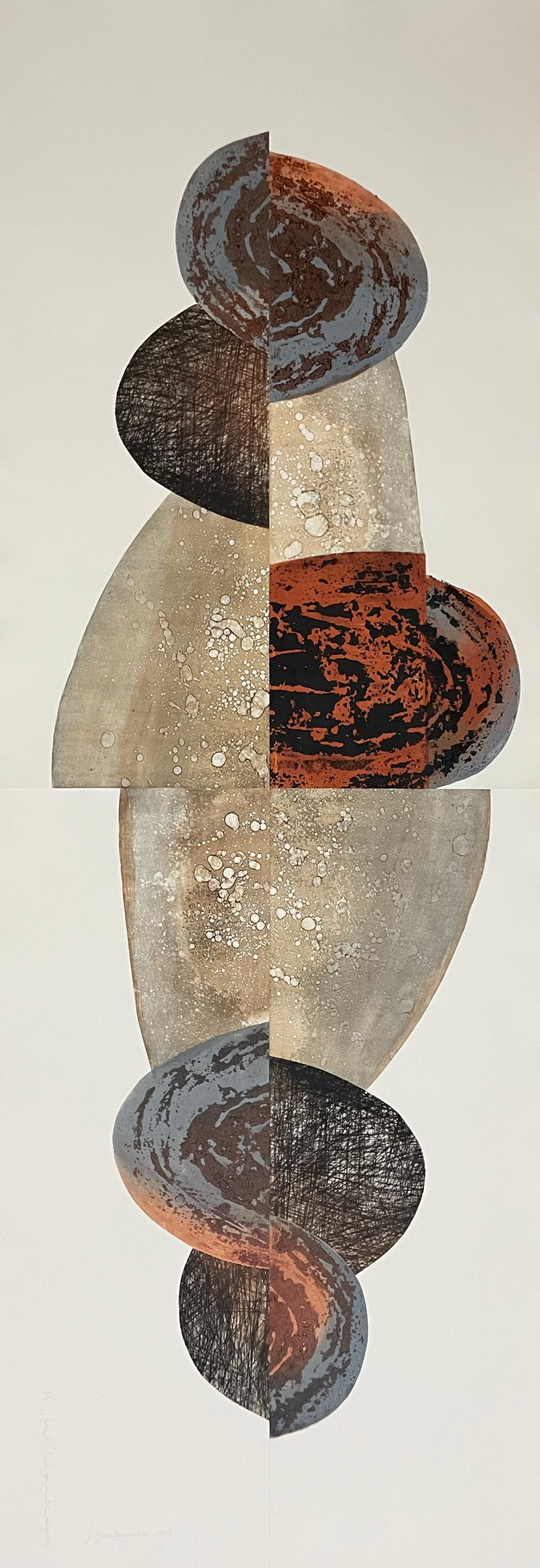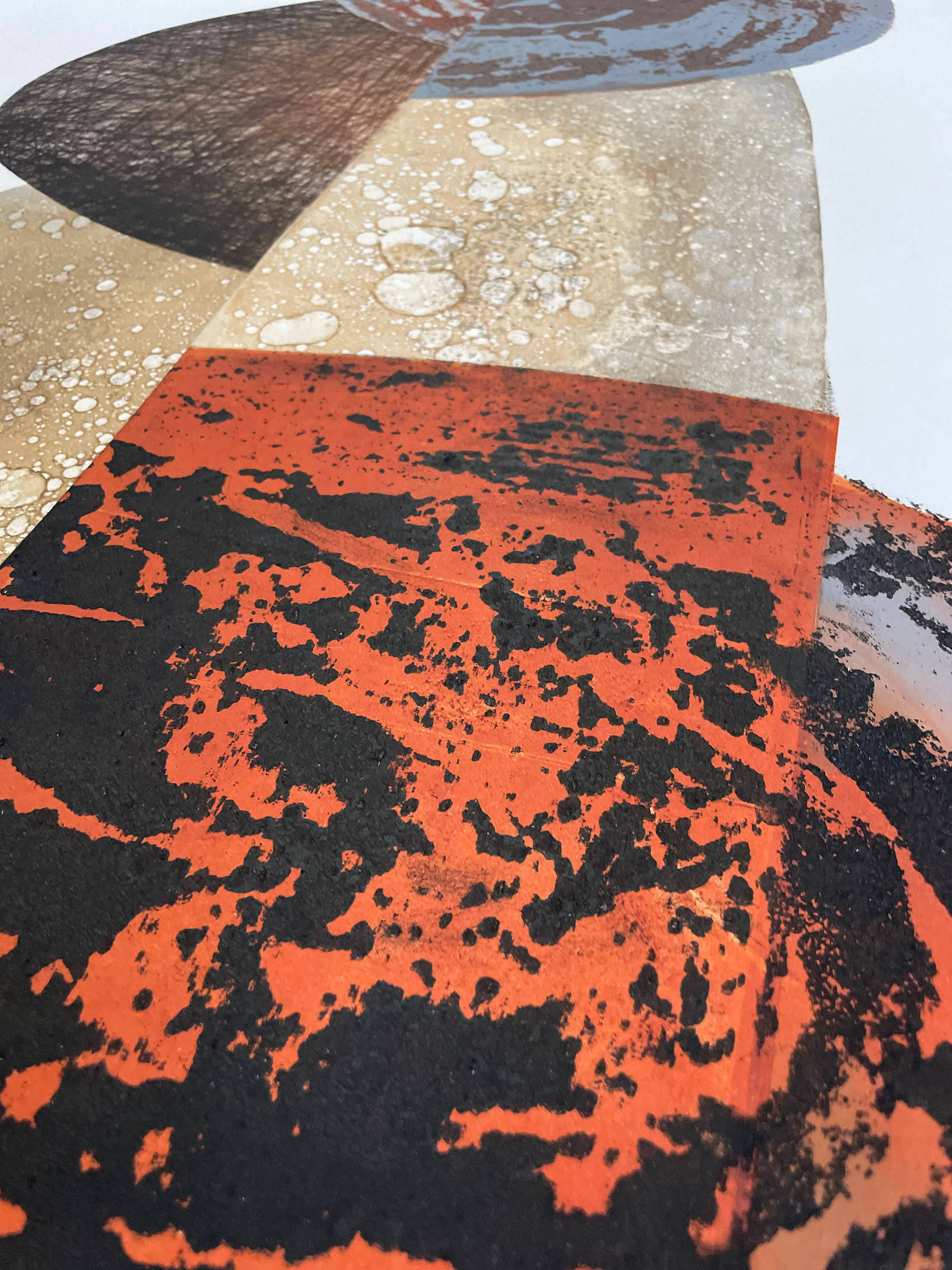 Surowa, smolista faktura. Rdzawe i brązowe odcienie przełamane stalową szarością. Masywna, organiczna forma. Huba.