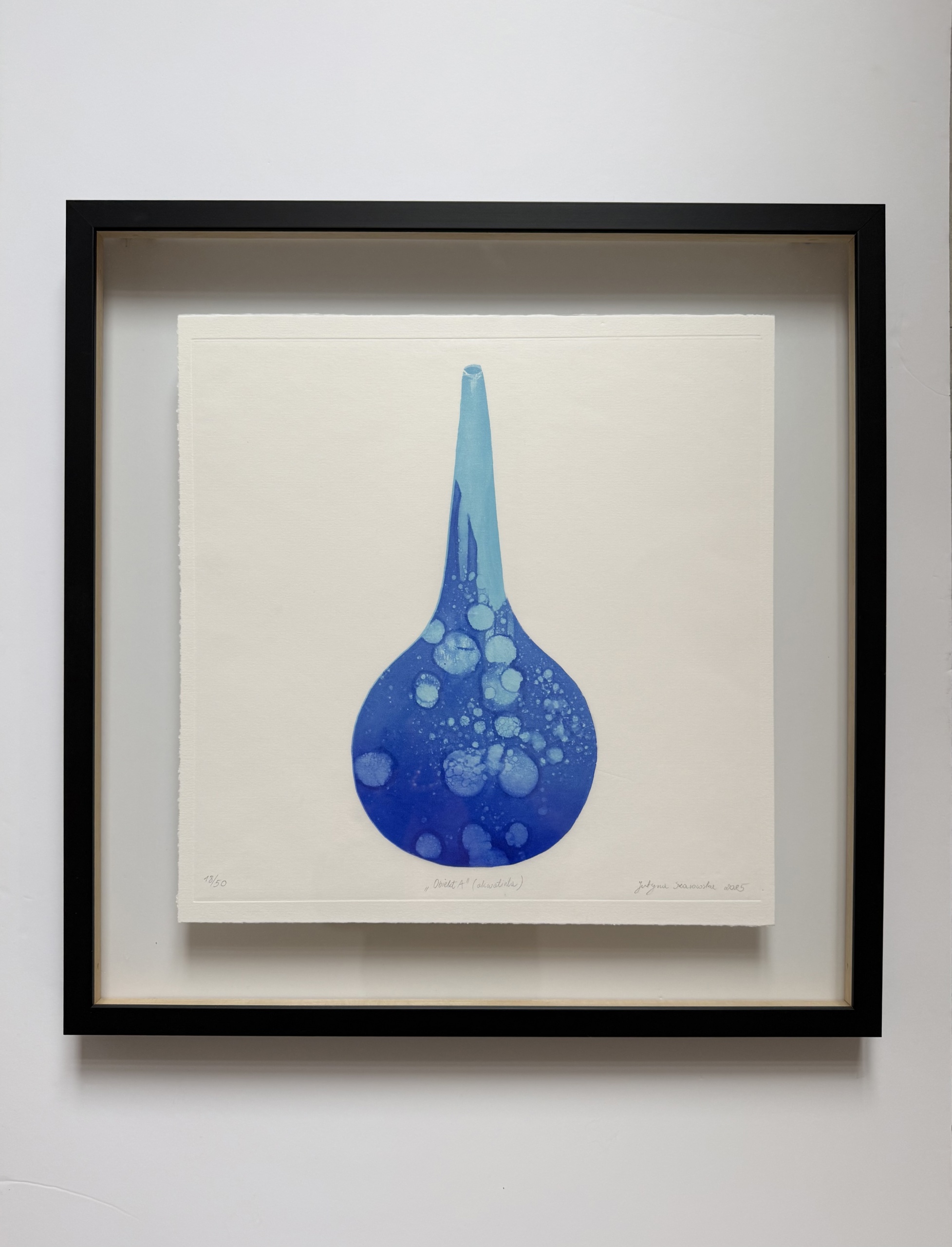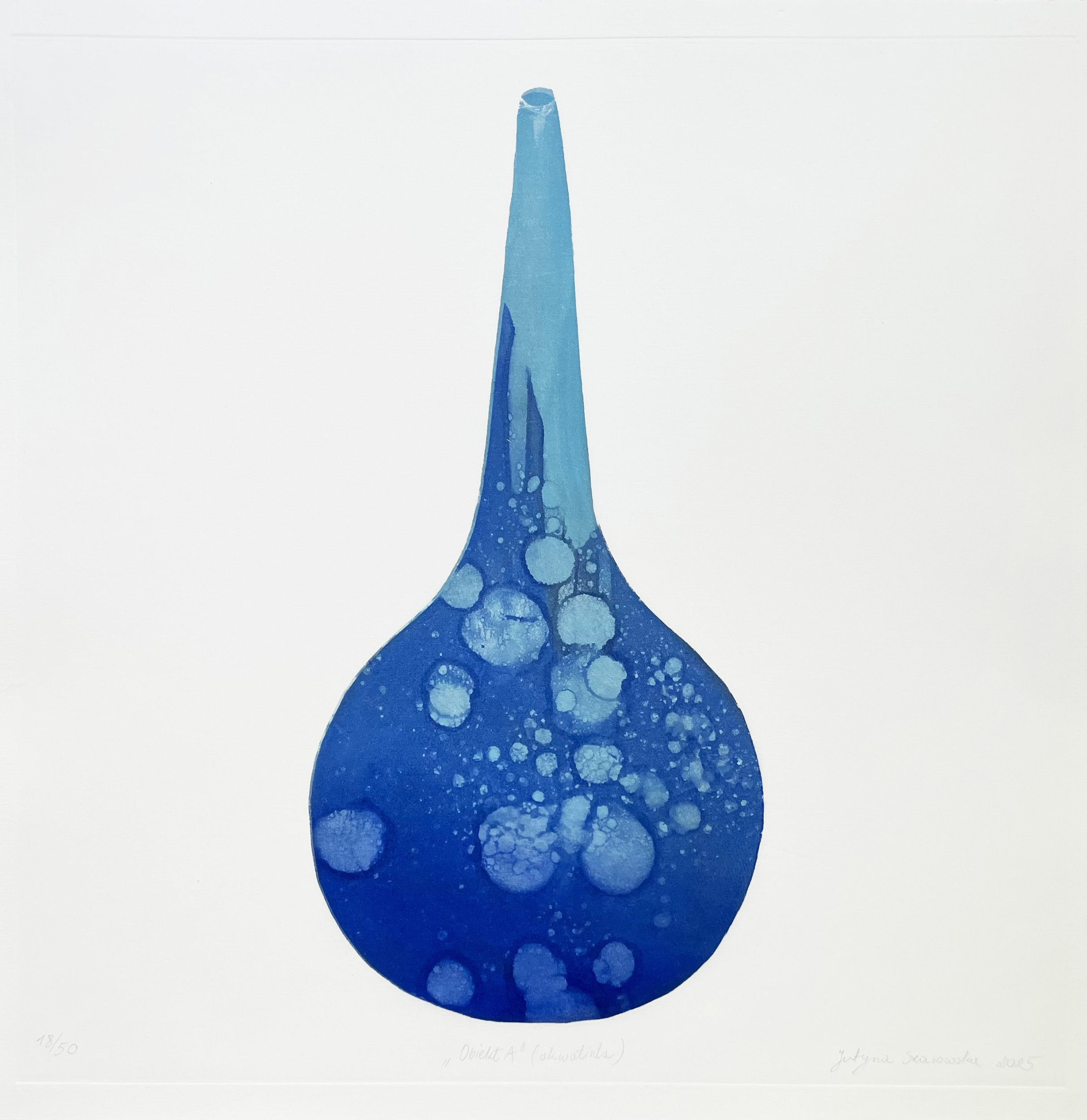 Cykl „Obiekty” to limitowana edycja pięćdziesięciu grafik wykonanych w technice akwatinty. Każda odbitka, mimo wspólnej matrycy, jest unikatowa — różni się kolorem, tonacją, a niekiedy także papierem. Nie istnieją dwie identyczne prace, co czyni każdą z nich osobnym, kolekcjonerskim obiektem.