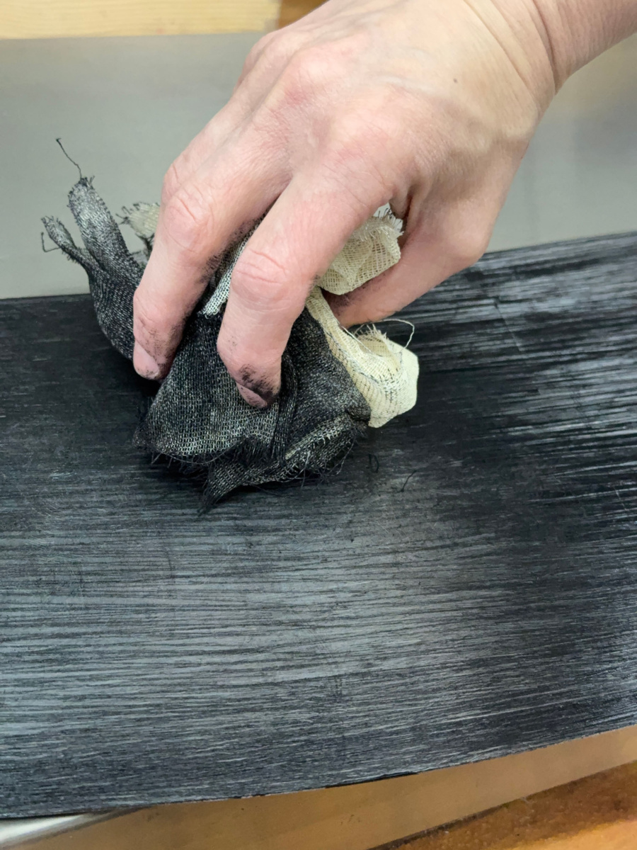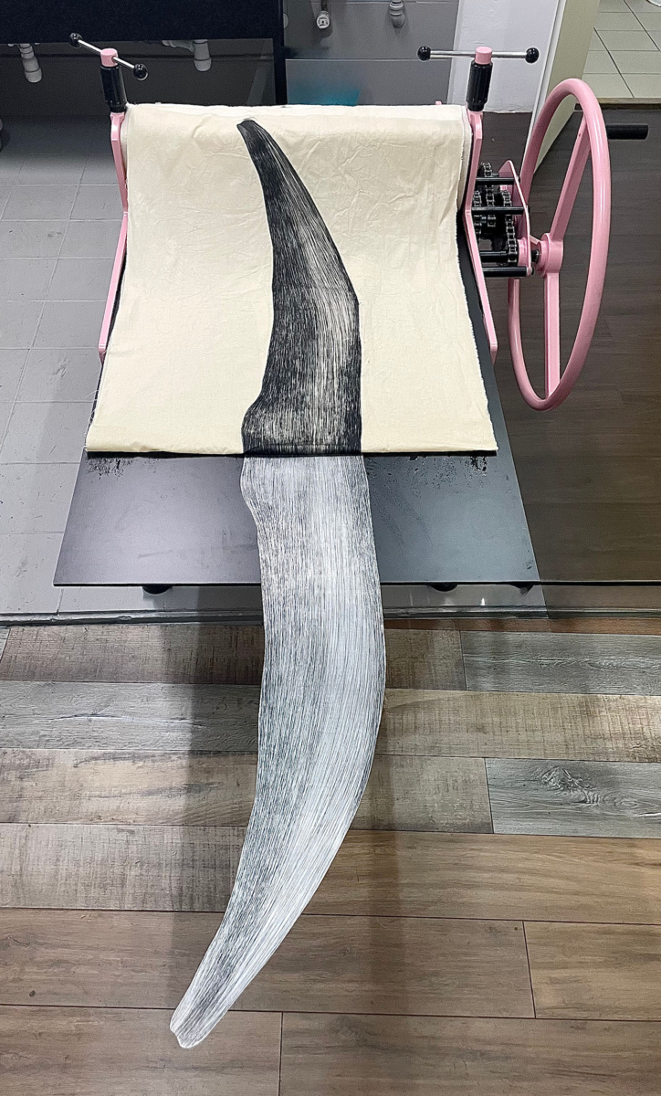 Najpierw rozgrzewam matrycę, musi być gorąca. Farbę Charbonnel wciskam w wytrawione zagłębienia raklą, potem wycieram powierzchnię merlą i dłonią. Ten etap jest najbardziej fizyczny – ręce są czarne, a opuszki palców zdarte. Sposób wycierania wpływa na końcowy ton odbitki w podobnym stopniu jak samo trawienie.